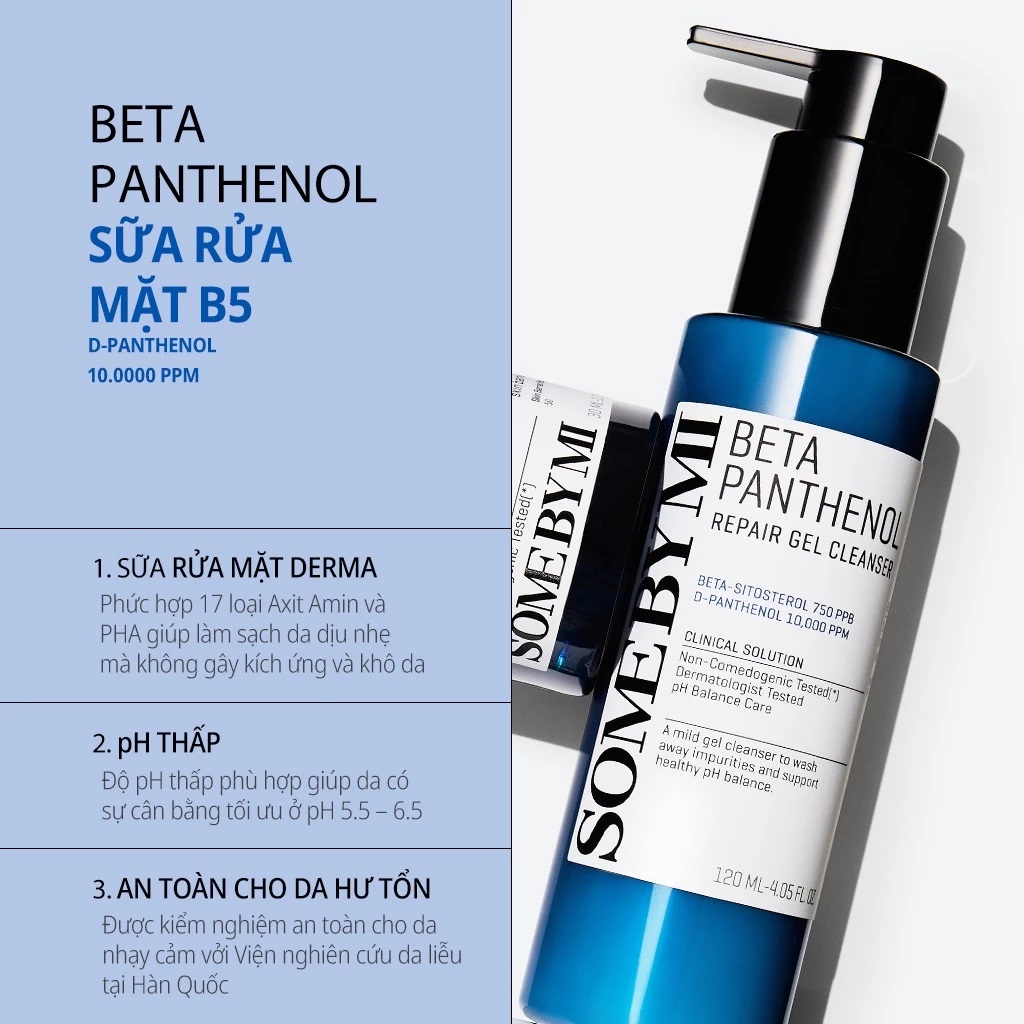 - Some By Mi Beta Panthenol Repair Gel Cleanser là sữa rửa mặt dạng gel thuộc dòng Beta-Panthenol Repair, tập trung vào việc làm sạch dịu nhẹ và phục hồi hàng rào bảo vệ da. Sản phẩm được thiết kế cho da nhạy cảm, da khô, da mụn hoặc da bị tổn thương sau các liệu trình điều trị (như AHA/BHA, retinol). Với công thức Beta-Panthenol™ (kết hợp D-Panthenol và Beta-Sitosterol), gel cleanser giúp loại bỏ bụi bẩn, dầu thừa mà không làm khô da, đồng thời cân bằng pH da ở mức lý tưởng 5.5-6.5. Dung tích 120ml, phù hợp sử dụng hàng ngày cho mọi loại da, đặc biệt da yếu và dễ kích ứng.